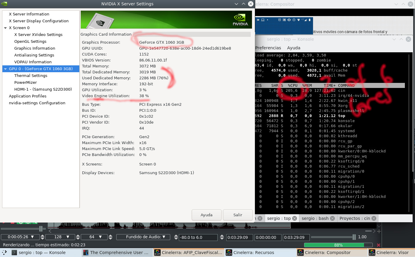 Thanks for reply! I could compile CinGG with cuda, I used debian's package nvidia-cuda-sdk to compile ffmpeg and CinGG too, but cuda samples is needed too (basically, helper_cuda.h and few more). Debian use /usr/lib/cuda for libs and /usr/bin for nvcc, so I must to create a symbolic to /usr/lib/cuda/bin/nvcc (export variable path was not sufficient, compilation procces search nvcc un CUDA_PATH/bin/nvcc) that's all. My original question was: Can I pass some imput parameters to ffmpeg in render process? And I ask this again. Why? Becase ffmpeg -hwaccel cuvid can enconder x264 at 13,7x and without this parameter, just 2.5x. And at the moment, x264 is sufficient for me. Thanks a lot! Sincerelly. Sergio El 2020-04-10 01:21, Phyllis Smith escribió: