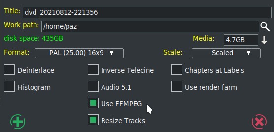 no, there is unchecked by default option about using ffmpeg. Because apparently I busted mpeg2 encoder - try to check this option? I had already activated "ffmpeg". I tried again as root (last time I wasn't) and I still have crashes. I have dvdauthor but I didn't put the external dvd player (I should get it back, who knows where it is!). See image. At the terminal I have these messages: