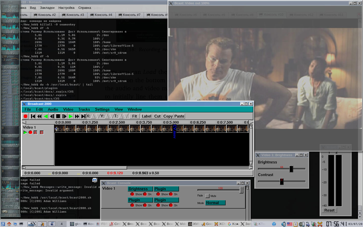 Victory! It was simple matter of enabling displaying track's content AND hitting 'fit' button :} Audio sort of works too, if I edit /usr/local/bcast/bcast2000.sh for inclusion of aoss wrapper (but it crashes if I try to pause playback) Cool, what else I can say :} And yes, there WAS vertical timeline :} (By the way, resizing main window with all those thumbnails on modern X server IS slow.... you can see it redrawing itself multiple times for few seconds)
