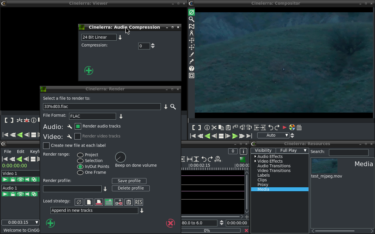 GIT checkin of Flac 1.4.0 is complete with the addition of user configurable Compression Level by clicking on the Audio Wrench in the render menu (default is 0 which seems to be similar to the current usage as far as I can tell). This patch by Andrew + he added 3 new ALAC audio render formats which is *A*pple *L*ossless *A*udio *C*odec. As usual, Andrea did a lot of building and early testing which is very valuable because he keeps his Arch operating system constantly updated which I have not been able to do. Interesting to note that the Flac team made the statement that it has been 9 years between the initial 1.3.x and 1.4.x versions !