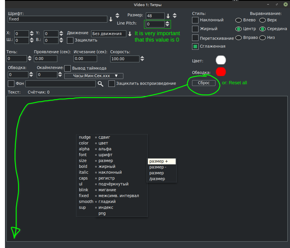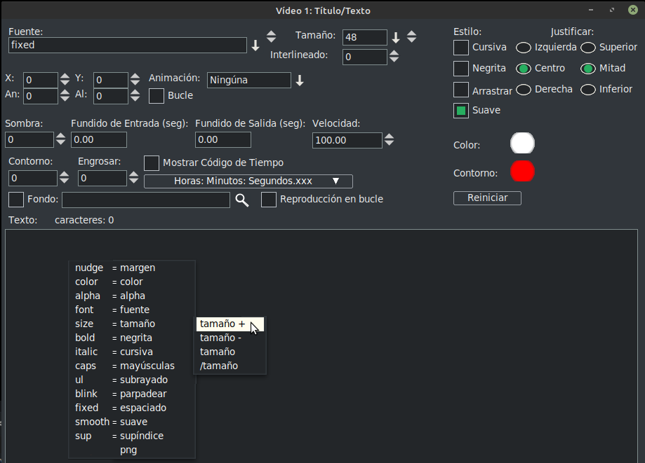 Hi Andrew, I have tested these changes, I will give you an analysis below. RESET: SUGGESTIONS In file /cinelerra-5.1/plugins/titler/titler.C I would change outline_color = RED; It doesn't make much sense that both colors are white. Red is a good starting color for an outline. In file /cinelerra-5.1/plugins/titler/titlerwindow.C The following parameters are missing client->config.timecode = 0; // it is important in a reset to turn off this option if it has been activated client->config.timecode_format = 1; // In audiovisual the default time code is HH:MM:SS:frames, that is hours, minutes, seconds and frames. client->config.outline_color = RED; // It doesn't make much sense that the font color and outline are the same client->config.line_pitch = 0; // VERY IMPORTANT THAT THIS VALUE MUST BE 0, ZERO INDICATES THAT IT IS DISABLED AND THE SPACING BETWEEN LINES WILL BE USED BY DEFAULT OF THE CHOSEN FONT, 24 IS A MISTAKE OVERLAPPING THE LINES. client->config.background = 0; // If the background has been activated, the reset must deactivate it. client->config.background_path // It would be good if this tex box was left blank in a reset. The content of the box where we add the texts should also be emptied One problem that I observe is precisely that the parameter: line_pitch it does not update the number, for example, if I have entered 50 and do a reset, it should be set to 0 (24 is not correct) and it actually sets to 0 internally, but this change is not reflected in the text box. IMPORTANT: The position of the button can cause confusion, normally in cinelerra this button should be in the lower left part of the window. Where it is now looks like a reset only for colors. I can think of two solutions, or put it at the bottom left, or change the text "Reset" to "Reset All" ------------------------------------------------------------------------------- TAGS HTML SUGGESTIONS It would be very helpful for a person who works in a language other than English to see the drop-down in this way, if the user does not know what a label does when he sees his name because he does not know English, with the right button he can consult quickly. Can this be done? Example in Russian: [image: imagen.png] Line pith = Расстояние между линиями or Line pith = Space between lines = Межстрочный интервал I don't know Russian, but I have a good friend who is and has given me these translations of 'Line Pith', It is a long text, I do not know if there will be an abbreviation for this term in Russian. Example in Spanish: [image: imagen.png] Thank you very much for your good work. El dom, 24 ene 2021 a las 16:50, Andrew Randrianasulu via Cin (< [email protected]>) escribió: