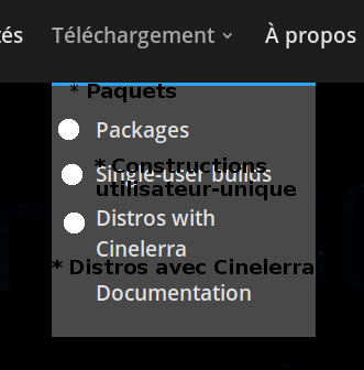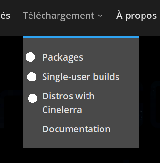 Image 1: * Packages -> Paquets * Single-user builds -> Constructions mono-utilisateur (note: better translation than the one in the picture) * Distros with Cinelerra -> Distros avec Cinelerra
