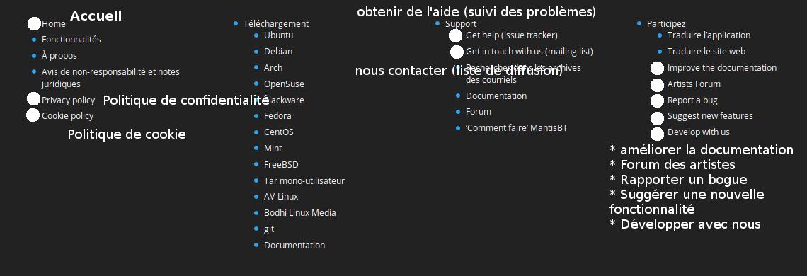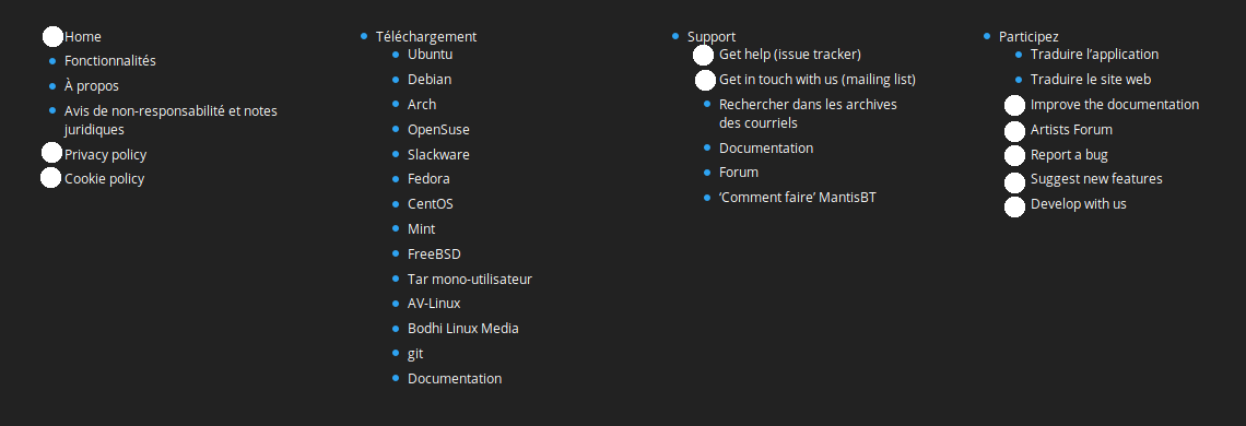 Image 5: * Home -> Accueil * Privacy policy -> Politique de confidentialité * Cookie policy -> Politique de cookie * Get help (issue tracker) -> Obtenir de l'aide (suivi des problèmes) * Get in touch with us (mailing list) -> Nous contacter (liste de diffusion) * Improve the documentation -> améliorer la documentation * Artists forum -> Forum des artistes * Report a bug -> Rapporter un bogue * Suggest new features -> Suggérer de nouvelles fonctionnalités (note: better translation than the one in the picture)