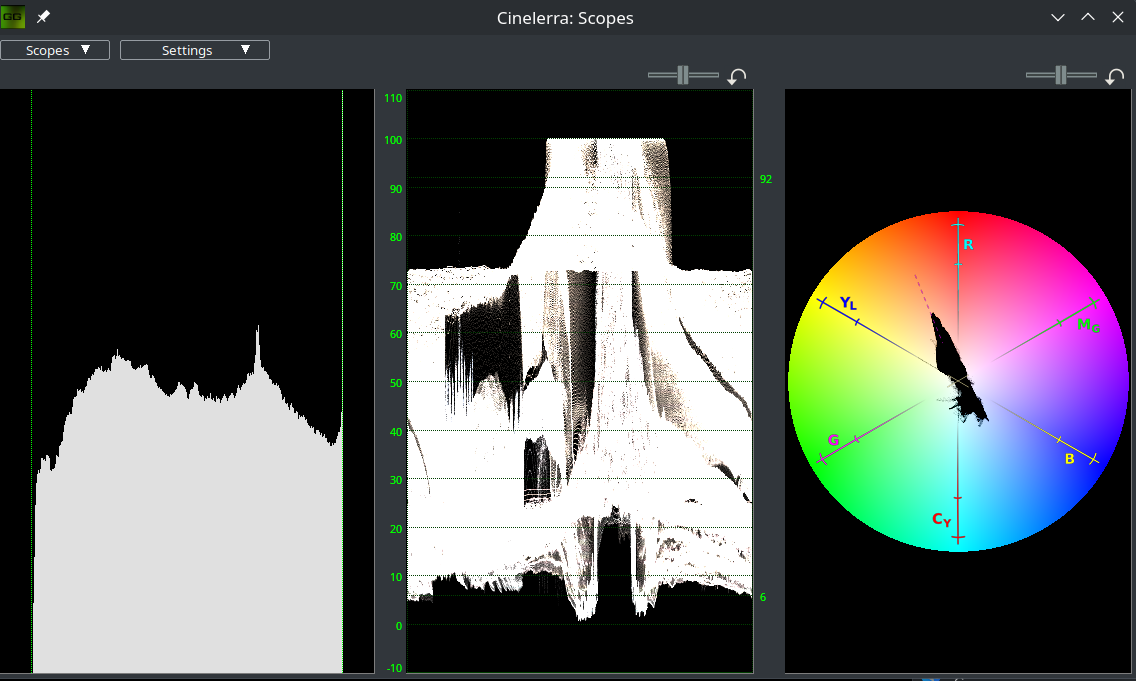 It seems to me that Adam's examples always involve integers, 8-, 10- or 16-bit, but always integers. Interesting that Adam's Histogram also shows data above 1.0, while in CinGG it happens with Histogram Bezier but not with Histogram (nor with Histogram of Scopes). Adam's waveform also shows data above 100% while CinGG's does not. See attached image. The png is just a screenshot captured to show what the original image looks like, since the contents of the window are not visible in CinGG. The original exr image gives the following result with ffprobe: Stream #0:0: Video: exr, gbrpf32le, 4096x2048 [SAR 1:1 DAR 2:1], 25 fps, 25 tbr, 25 tbn Such an image I simply downloaded from a free archive; I did not build it in Blender or Natron. If you want to try it out it can be found here: https://polyhaven.com/a/small_empty_room_1 I didn't quite understand how to do another "lowering technique" test.