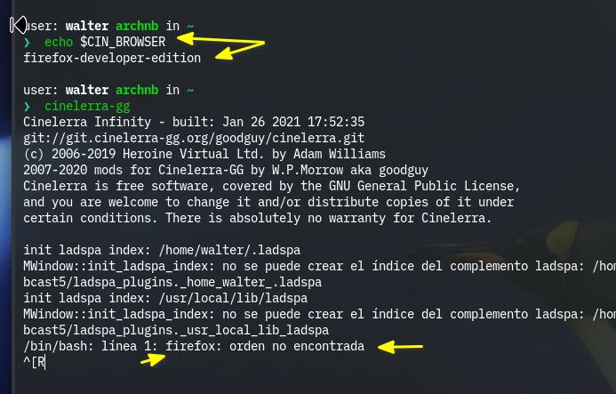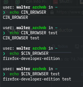 I understand, the $ is to tell the interpreter that it is a variable if it is not going to print the written text literally [1] I noticed that I had a problem in a function in zshenv, which doesn't seem to export well. but it is already corrected. only added to bashrc, zshrc, profile, etc. export CIN_BROWSER=firefox-developer-edition Thanks greetings -- - | Walter Casanova | - - | Gnu / Linux - SysAdmin | - -------- [1] imagen