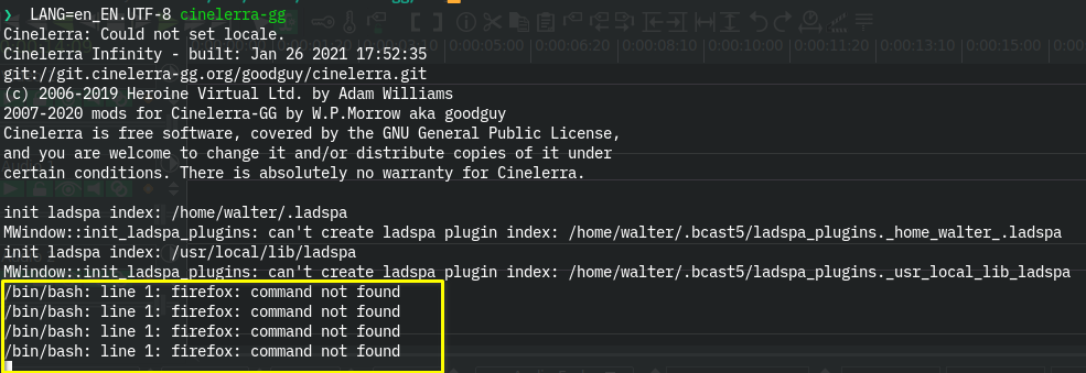 Cinelerra Infinity - built: Jan 26 2021 09:26:19 ... /bin/bash: firefox-developer-edition: command not found