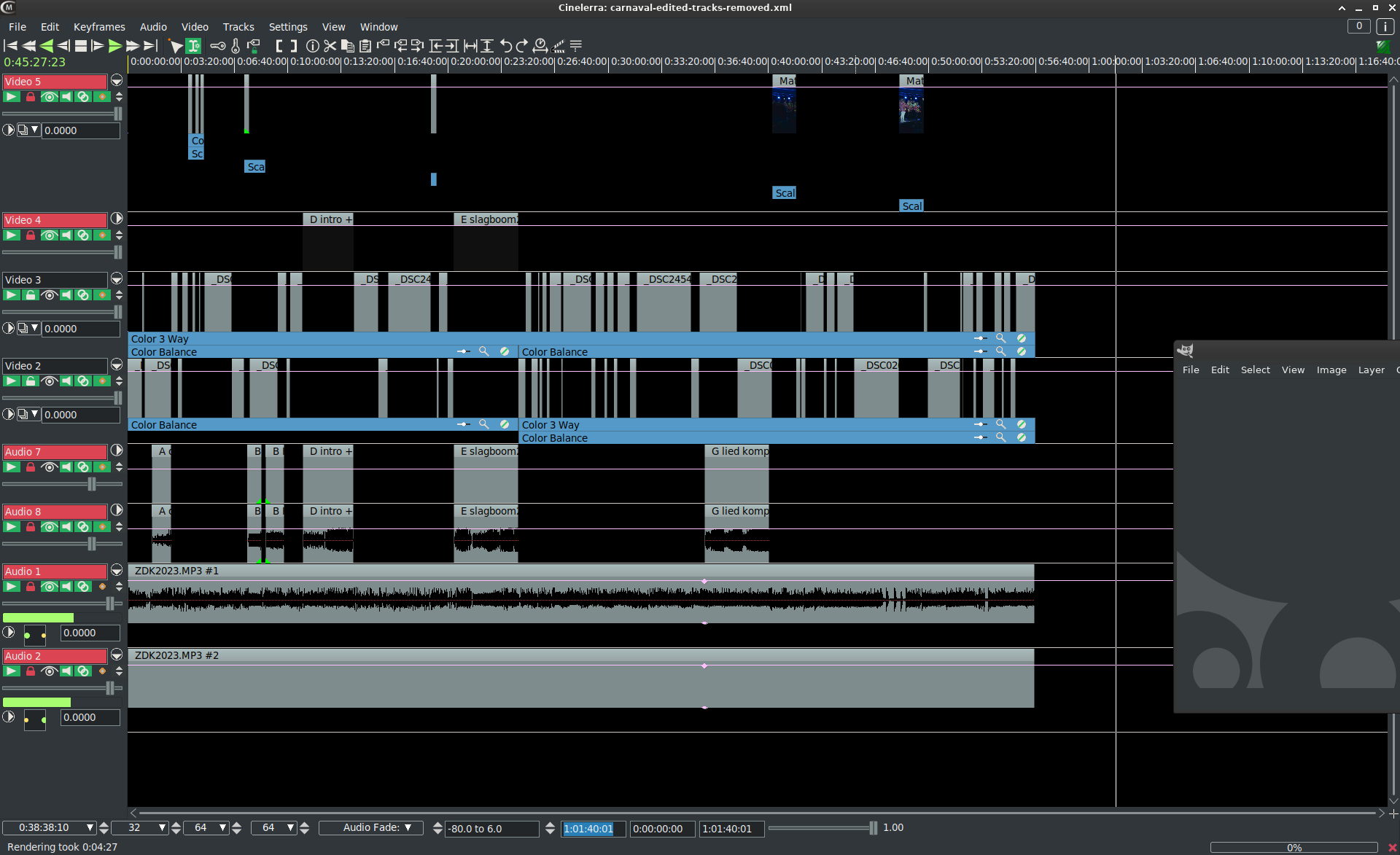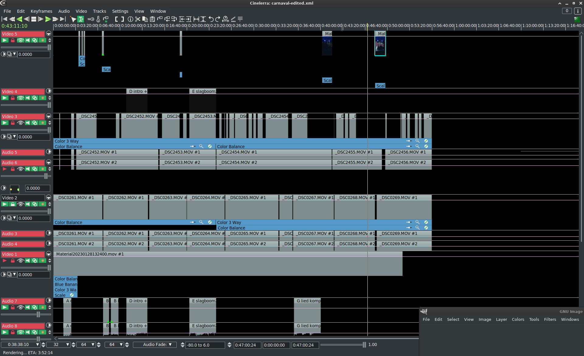 I am currently trying to render a feature which is 57min in duration. I noticed that cinelerra in this project has an enormous problem rendering two video's stacked on top of eachother. There is (as far as I am aware of) no compositing intended, no projector movement, top track should have priority over lower tracks.