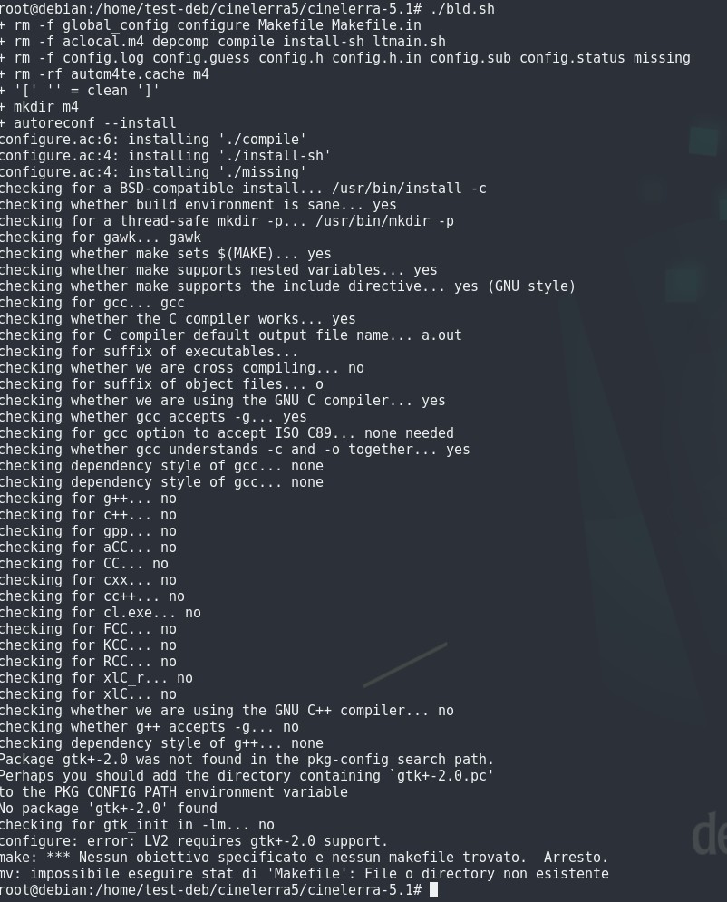 I think this script should give you some idea what to install: http://git.cinelerra-gg.org/git/?p=goodguy/cinelerra.git;a=blob;f=cinelerra-... cinelerra-5.1/blds/bld_prepare.sh it run as root and hopefully will just take one parameter (os type), "debian" in your case