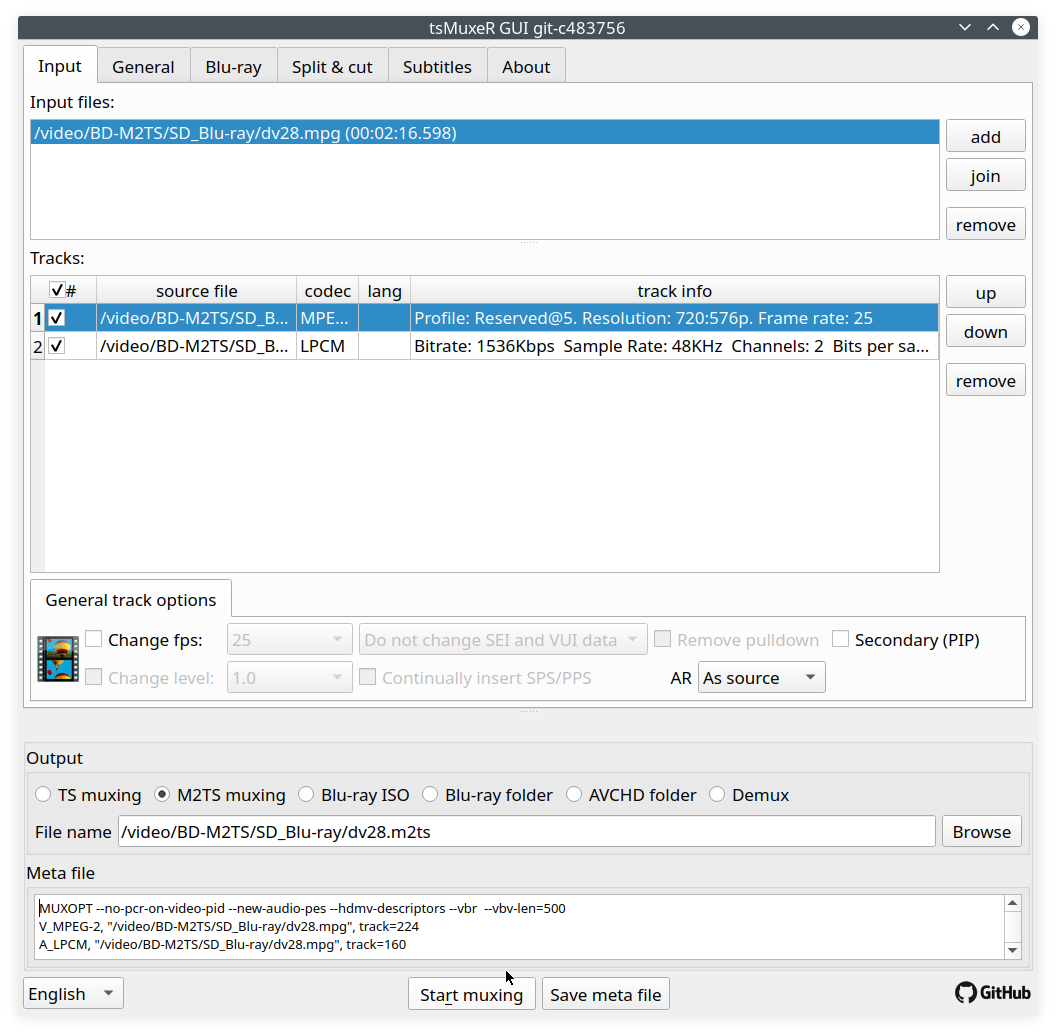=========== ffmpeg -i dv28.dv -c:v mpeg2video -pix_fmt yuv422p -refs 1 -bf 2 -b:v 25M -maxrate 25M -minrate 25M -bufsize 45M -muxrate 45M -dc 10 -s 720x576 -aspect 4:3 -c:a pcm_s16be -f vob dv28.mpg Still a lot of ouput messages (some hundreds), tested -bufsize 45M -muxrate 45M (and 50M without change): [vob @ 0x557560237700] packet too large, ignoring buffer limits to mux it [vob @ 0x557560237700] buffer underflow st=1 bufi=6892 size=7680 ........... and lastly frame= 3416 fps=359 q=1.6 Lsize= 446718kB time=00:02:16.60 bitrate=26790.0kbits/s speed=14.4x video:415625kB audio:25620kB subtitle:0kB other streams:0kB global headers:0kB muxing overhead: 1.240393% ----------- The format setting "-f vob" in the original script, was maybe the trick that got ffmpeg to "mux" PCM audio into the mpg container, and not to other I tried(?) VOB is usual the DVD-video container where video has max bitrate 9.8 Mbps. I could find again if Blu-ray specification allows "VOB-video" or MPG-video here with high bitrate 25M? ============= tsMuxer As FFMpeg would allow to mux PCM or remux MPG to M2TS, I tested tsMuxer, see the attached screenshot: tsMuxer_SD_M2TS Input file: dv28.mpg Tracs: MPEG-2 video stream and LPCM audio stream Output: M2TS muxing worked, Blu-ray ISO and Blu-ray Folder (tested as working fast and easy) ffmpeg -i dv28.m2ts 2>&1 >/dev/null | egrep "Video|Audio" Stream #0:0[0x1011]: Video: mpeg2video (4:2:2) (HDMV / 0x564D4448), yuv422p(tv, progressive), 720x576 [SAR 16:15 DAR 4:3], 25000 kb/s, 25 fps, 25 tbr, 90k tbn, 50 tbc Stream #0:1[0x1100]: Audio: pcm_bluray (HDMV / 0x564D4448), 48000 Hz, stereo, s16, 1536 kb/s ffmpeg -i dv28_Blu-ray.iso 2>&1 >/dev/null | egrep "Video|Audio" Stream #0:0[0x1011]: Video: mpeg2video (4:2:2) (HDMV / 0x564D4448), yuv422p(tv, progressive), 720x576 [SAR 16:15 DAR 4:3], 25000 kb/s, 25 fps, 25 tbr, 90k tbn, 50 tbc Stream #0:1[0x1100]: Audio: pcm_bluray (HDMV / 0x564D4448), 48000 Hz, stereo, s16, 1536 kb/s mediainfo dv28.m2ts | grep Format Format : BDAV Format/Info : Blu-ray Video Format : MPEG Video Format version : Version 2 Format profile : 4:2:2@Main Format settings : BVOP Format settings, BVOP : Yes Format settings, Matrix : Default Format settings, GOP : M=3, N=12 Format : PCM Format settings : Big / Signed mediainfo dv28_Blu-ray.iso | grep Format Format : MPEG Video Format version : Version 2 Format : MPEG Video Format version : Version 2 Format profile : 4:2:2@Main Format settings : BVOP Format settings, BVOP : Yes Format settings, Matrix : Default Format settings, GOP : M=3, N=12 tree -h BDMV BDMV ├── [4.0K] AUXDATA ├── [4.0K] BACKUP │ ├── [4.0K] BDJO │ ├── [4.0K] CLIPINF │ │ └── [1.8K] 00000.clpi │ ├── [ 120] index.bdmv │ ├── [ 290] MovieObject.bdmv │ └── [4.0K] PLAYLIST │ └── [ 170] 00000.mpls ├── [4.0K] BDJO ├── [4.0K] CLIPINF │ └── [1.8K] 00000.clpi ├── [ 120] index.bdmv ├── [4.0K] JAR ├── [4.0K] META ├── [ 290] MovieObject.bdmv ├── [4.0K] PLAYLIST │ └── [ 170] 00000.mpls └── [4.0K] STREAM └── [456M] 00000.m2ts 11 directories, 9 files ===========
