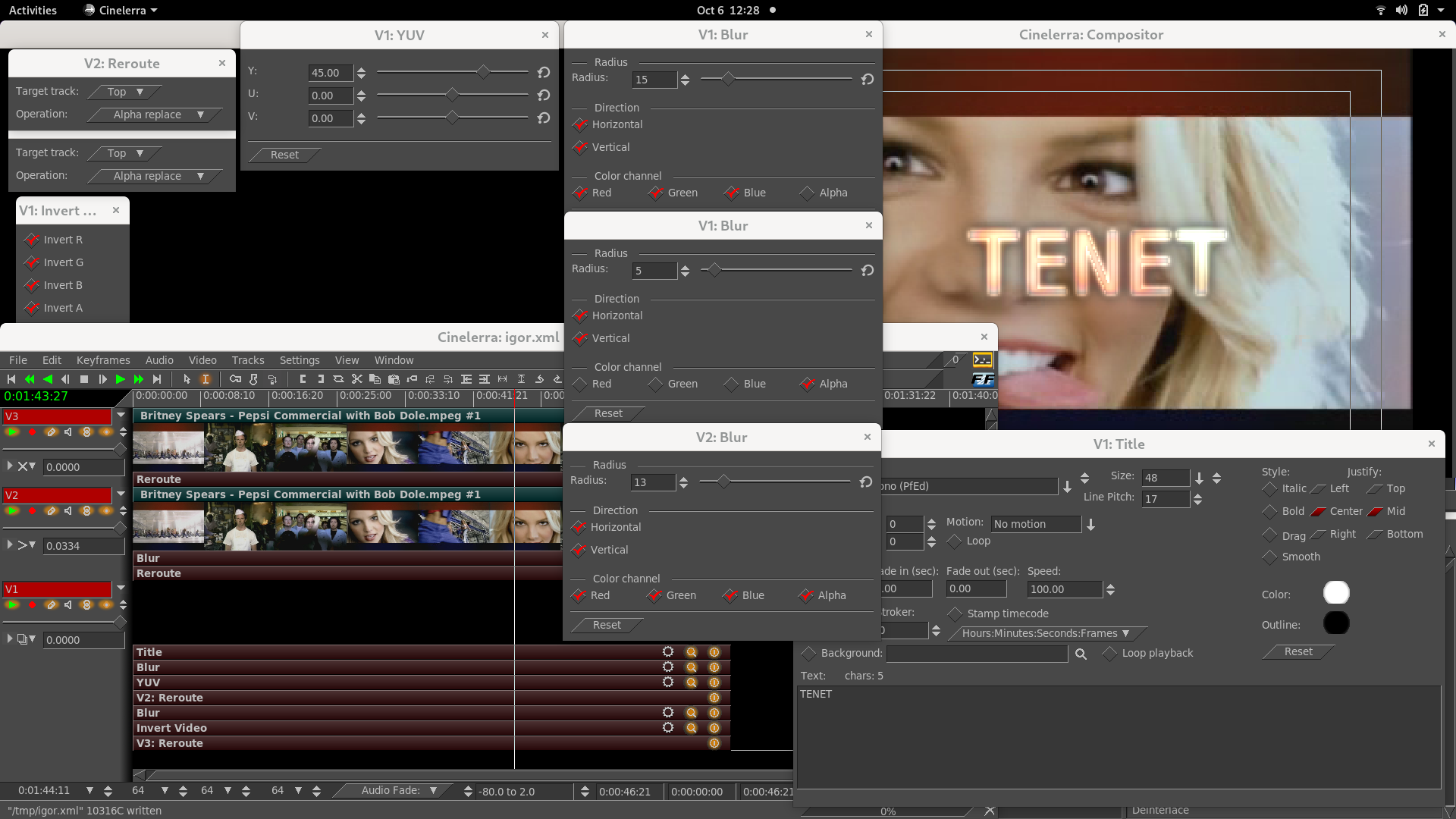 OK, it looks like the font I used was the only problem and why I could not duplicate the results. Loading IgorBeghetto's xml file shows it works just right (it is amazing what he can do !). So then I could duplicate with any video I wanted so anyone can do this too. See attached which shows similar results. Thank you as always IgorBeghetto. On Sat, Oct 8, 2022 at 3:26 AM Igor BEGHETTO via Cin < [email protected]> wrote: