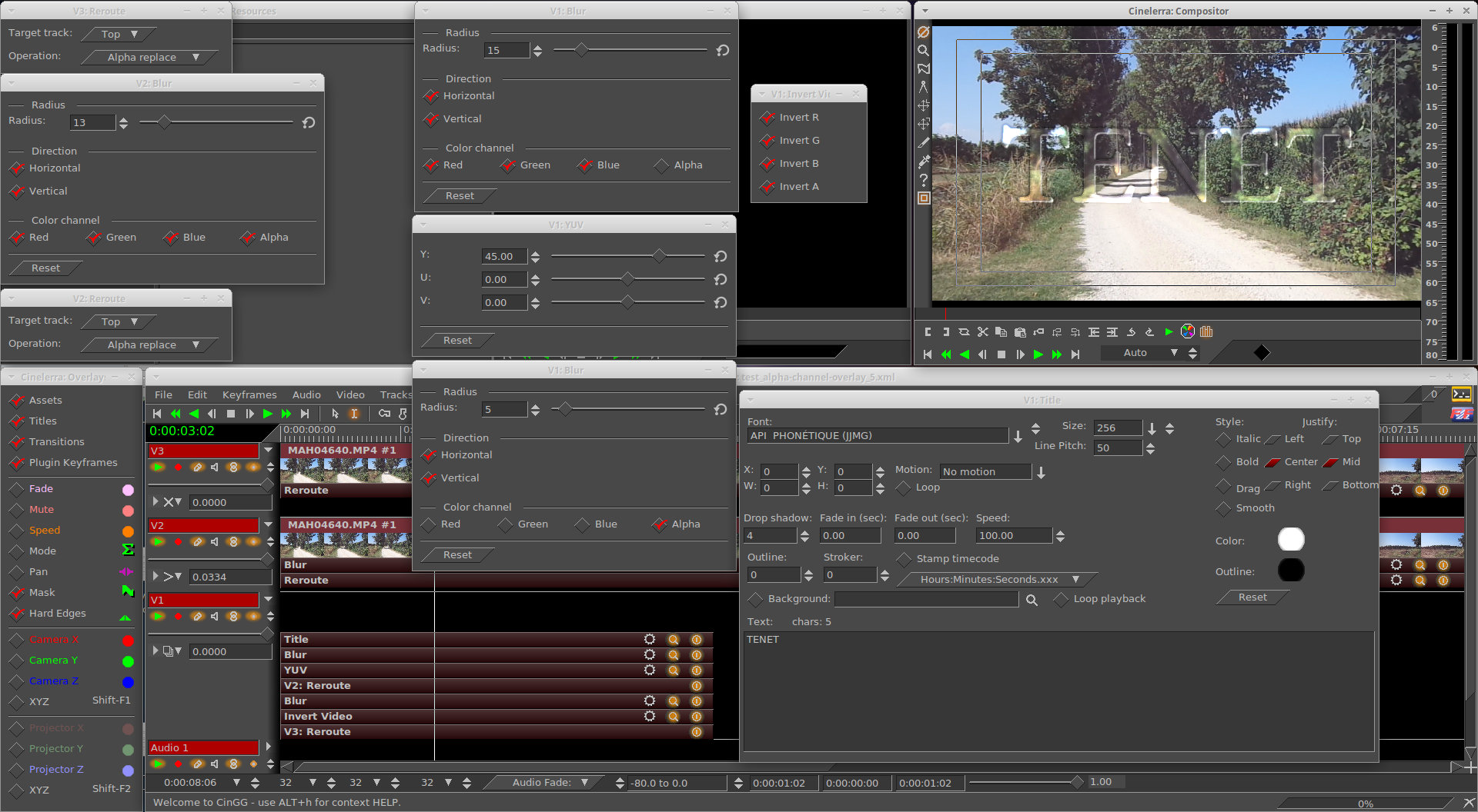 Here, only an example about Igor_ubuntu's Reroute and Alpha Channel, in Cinelerra-GG. This is not meant to be a competition but to show what Cinelerra-GG can do, referring to Igor_ubuntu's tutorial. The output, of course, can not be like in Cinelerra-CV. - Project Format: 1280x720 @24fps, RGBA-8bit - Cinelerra-GG version: CinGG_20220630