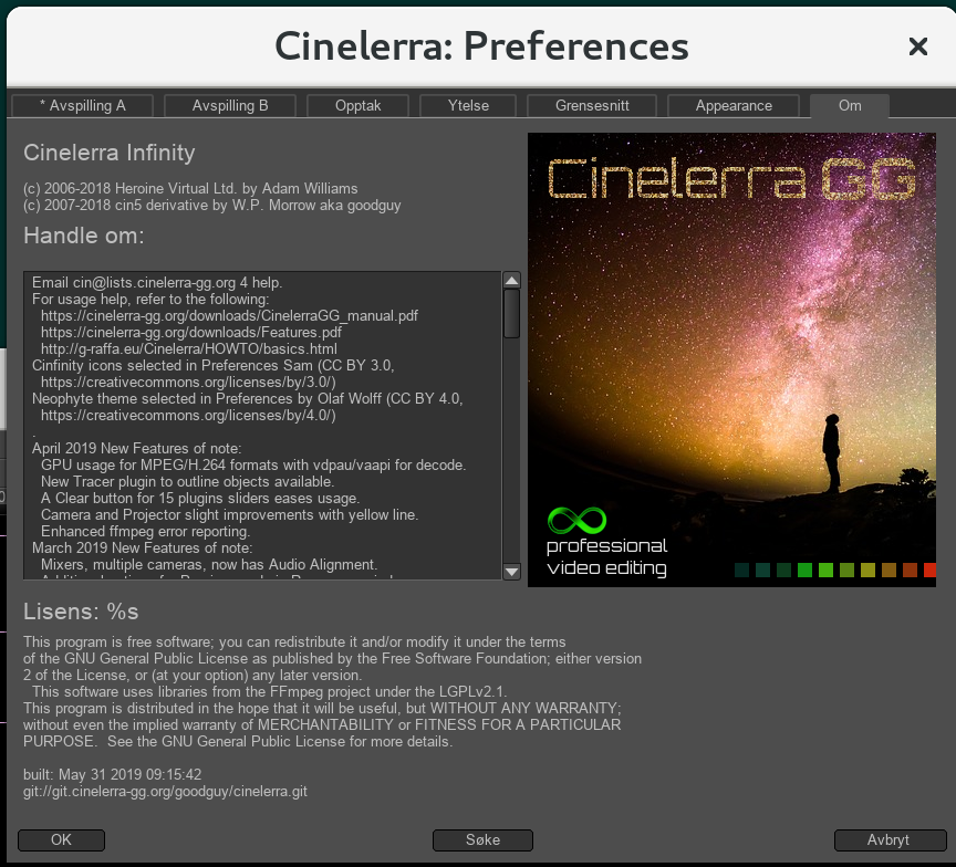 /Phyllis, 1. Attached are my current Cinelerra and Cinelerra10 respective "Prefs > About" screenshots on Leap 15.1. The time stamps here are May 31 2019 09:15:42 and May 31 2019 09:44:03, which don't directly fit ? 2. However a query with "rpm -qi" sounds to verify a more reasonable timestamp for each installed build - which seems to be the leap15.0 versions !? # rpm -qi cinelerra10bit | grep Build Build Date : Fri May 31 17:45:32 2019 Build Host : (none) And to verify that these packages are really installed: # rpm -qi cinelerra Name : cinelerra Version : 5.1 Release : 20190531 Architecture: x86_64 Install Date: Sat Jun 1 22:22:36 2019 Group : Applications/Multimedia Size : 188358102 License : GPL Signature : (none) Source RPM : cinelerra-5.1-20190531.src.rpm Build Date : Fri May 31 17:17:15 2019 Build Host : (none) Relocations : (not relocatable) URL : https://cinelerra-gg.org/ Summary : Multimedia Editing and construction Description : Multimedia editing and construction Distribution: (none) # rpm -qi cinelerra10bit Name : cinelerra10bit Version : 5.1 Release : 20190531 Architecture: x86_64 Install Date: Sat Jun 1 22:22:42 2019 Group : Applications/Multimedia Size : 191258073 License : GPL Signature : (none) Source RPM : cinelerra10bit-5.1-20190531.src.rpm Build Date : Fri May 31 17:45:32 2019 Build Host : (none) Relocations : (not relocatable) URL : https://cinelerra-gg.org/ Summary : Multimedia Editing and construction Description : Multimedia editing and construction Distribution: (none) 3. I have also downloaded the rpm packages manually with wget to make some comparisions: # ls -la cin* -rw-r--r-- 1 root root 61515412 May 31 17:19 cinelerra-5.1-leap15.0-20190531.x86_64.rpm -rw-r--r-- 1 root root 61524240 May 31 21:59 cinelerra-5.1-leap15.1-20190531.x86_64.rpm -rw-r--r-- 1 root root 61602272 May 31 22:34 cinelerra10bit-5.1-leap15.1-20190531.x86_64.rpm # du cin* 60084 cinelerra-5.1-leap15.0-20190531.x86_64.rpm 60088 cinelerra-5.1-leap15.1-20190531.x86_64.rpm 60164 cinelerra10bit-5.1-leap15.1-20190531.x86_64.rpm # diff cinelerra-5.1-leap15.0-20190531.x86_64.rpm cinelerra-5.1-leap15.1-20190531.x86_64.rpm Binary files cinelerra-5.1-leap15.0-20190531.x86_64.rpm and cinelerra-5.1-leap15.1-20190531.x86_64.rpm differ 4. Queries with the Leap 15.1 package manager zypper to verify 4.1. which cinelerra repo is enabled: # zypper lr -U cingg Alias : cingg Name : cingg URI : https://cinelerra-gg.org/download/pkgs/leap15/ Enabled : Yes GPG Check : ( p) Yes Priority : 99 (default priority) Autorefresh : On Keep Packages : Off Type : rpm-md GPG Key URI : Path Prefix : / Parent Service : Keywords : --- Repo Info Path : /etc/zypp/repos.d/cingg.repo MD Cache Path : /var/cache/zypp/raw/cingg 4.2. which cinelerra versions that is installed # zypper se -is cinelerra Loading repository data... Reading installed packages... S | Name | Type | Version | Arch | Repository ---+----------------+---------+--------------+--------+----------- i+ | cinelerra | package | 5.1-20190531 | x86_64 | cingg i+ | cinelerra10bit | package | 5.1-20190531 | x86_64 | cingg 4.3. Try if there are any Cinelerra updates available: # zypper up cinelerra Retrieving repository 'Hovedpakkebrønn for oppdateringer' metadata ............................................[done] Building repository 'Hovedpakkebrønn for oppdateringer' cache .................................................[done] Loading repository data... Reading installed packages... No update candidate for 'cinelerra-5.1-20190531.x86_64'. The highest available version is already installed. Resolving package dependencies... Nothing to do. # zypper up cinelerra Loading repository data... Reading installed packages... No update candidate for 'cinelerra-5.1-20190531.x86_64'. The highest available version is already installed. Resolving package dependencies... Nothing to do. # rpm -qi cinelerra | grep Build Build Date : Fri May 31 17:17:15 2019 Build Host : (none) -------------------- Of course I can remove the current installed leap15.0 packages and install the downloaded leap15.1 versions. But first I want to let you see over this again, as it sounds to me that the upgrade cannot assure to pick up the right version from a shared repo? Terje / /
