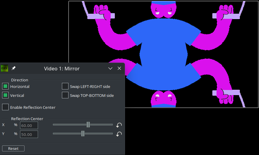 Also checked new Mirror video plugin (anonymous contribution) into GIT and if Andrea has time to build and check it out and update the Plugins.tex file to include it, that would be highly appreciated. I did update Info so that if Info is turned on in the Resources window and you highlight Mirror you can see that as shown next. Mirror: Mirror horizontal or vertical with the ability to swap left to right or top to bottom. And if enable reflection center checked, can vary X/Y centering. + effect can work with or without "Enable Reflection Center" but when "Enable Reflection Center" is CHECKED the swap side is automatic so that both the CheckBoxes "Swap LEFT-RIGHT side" and "Swap TOP-BOTTOM side" are hidden and disabled.