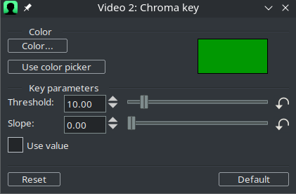 Chromakey plugin has had its menu improved by anonymous contribution and it has been checked into GIT. (Andrea, can you test it too? and check the manual to make sure still matches and make new image?) Improvements include: - added Default button - default values for Threshold and Slope changed from 60 to 10 and from 100 to 0 as much more practical - position of Threshold and Slope switched because Threshold is more relevant (Previous 2 items were suggested by Andrea) - textbox with arrows added for much easier access to current setting - individual "reset" icons added - location of "Use color picker" put into better position - other minor stuff