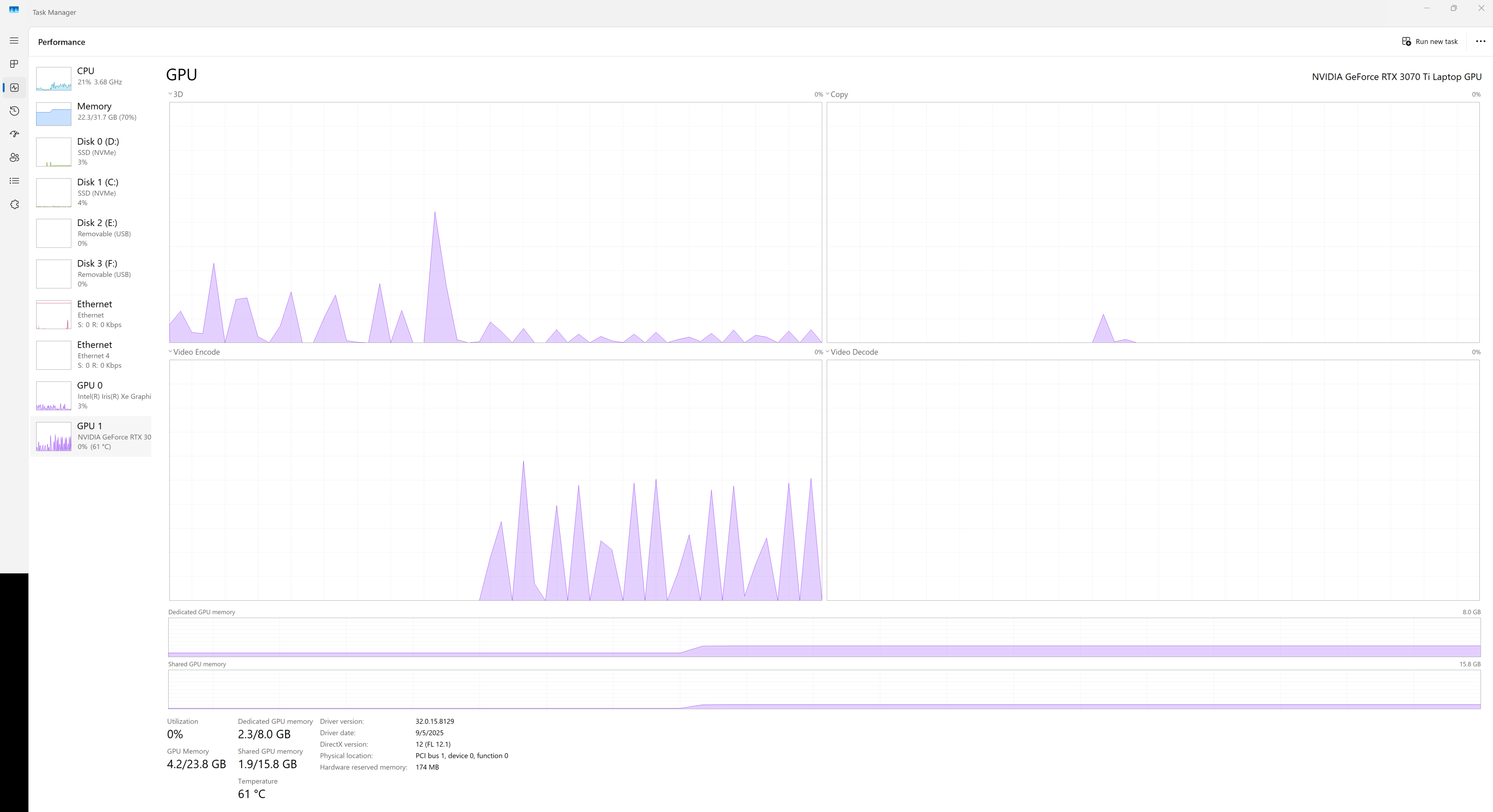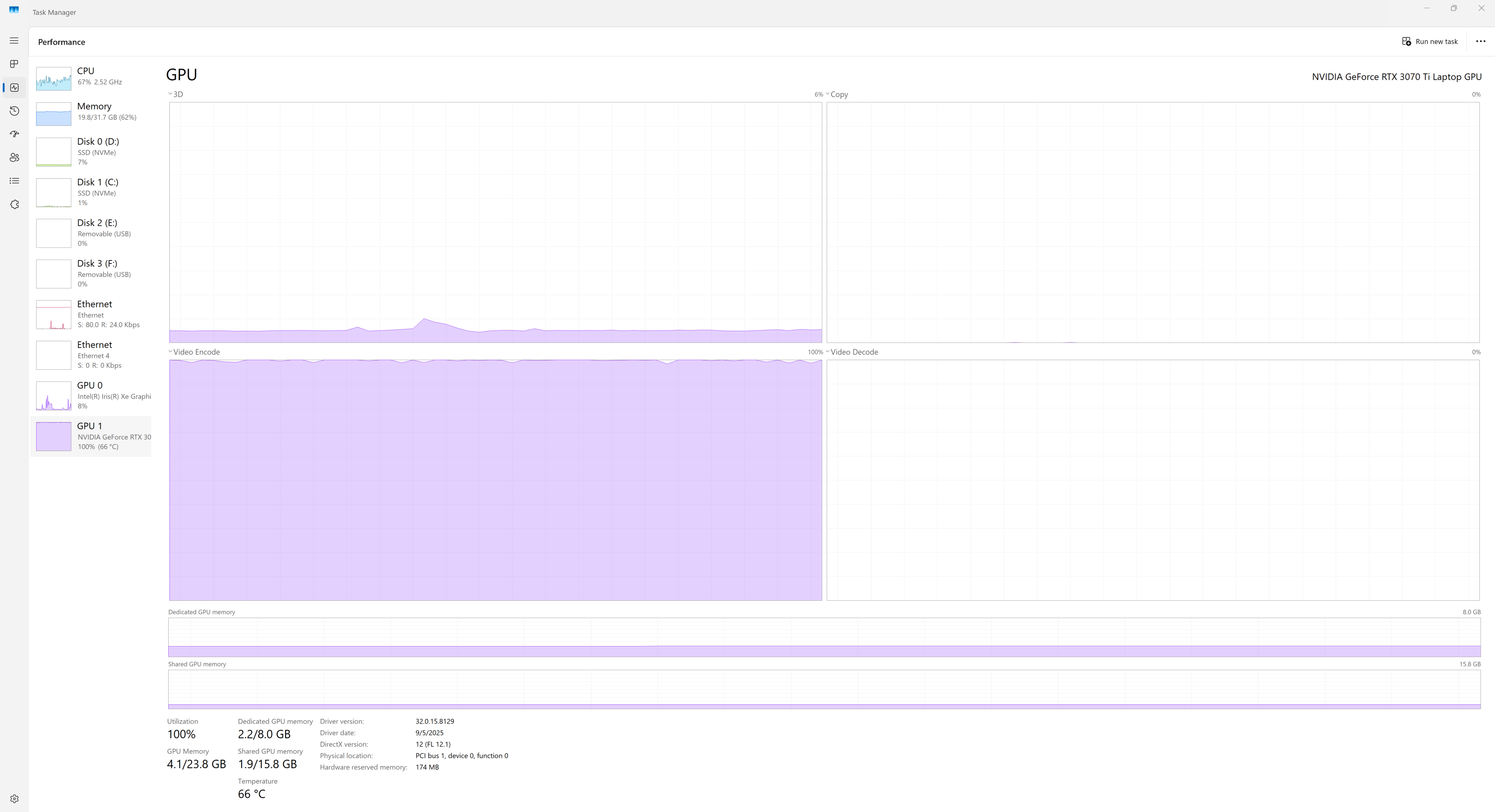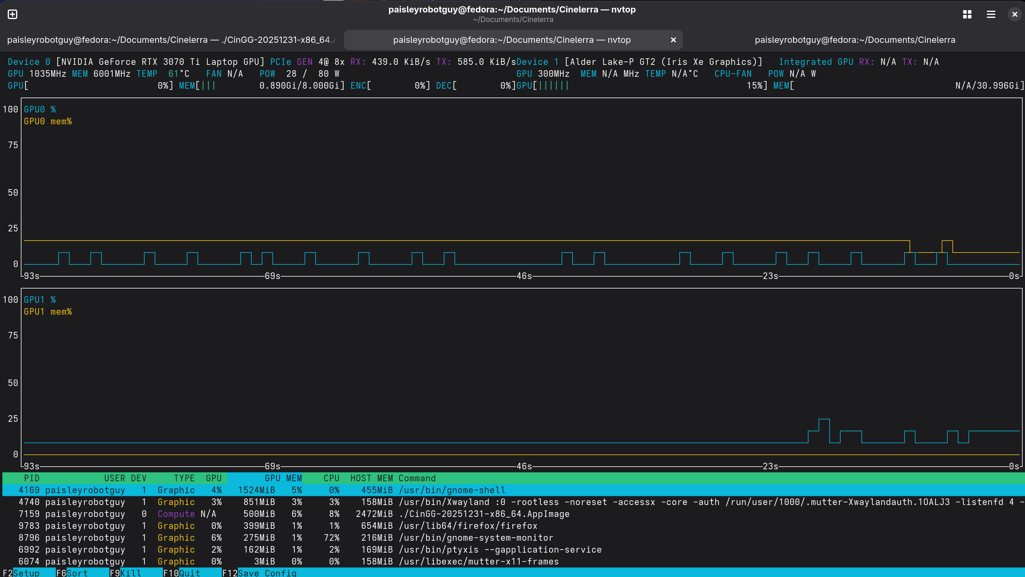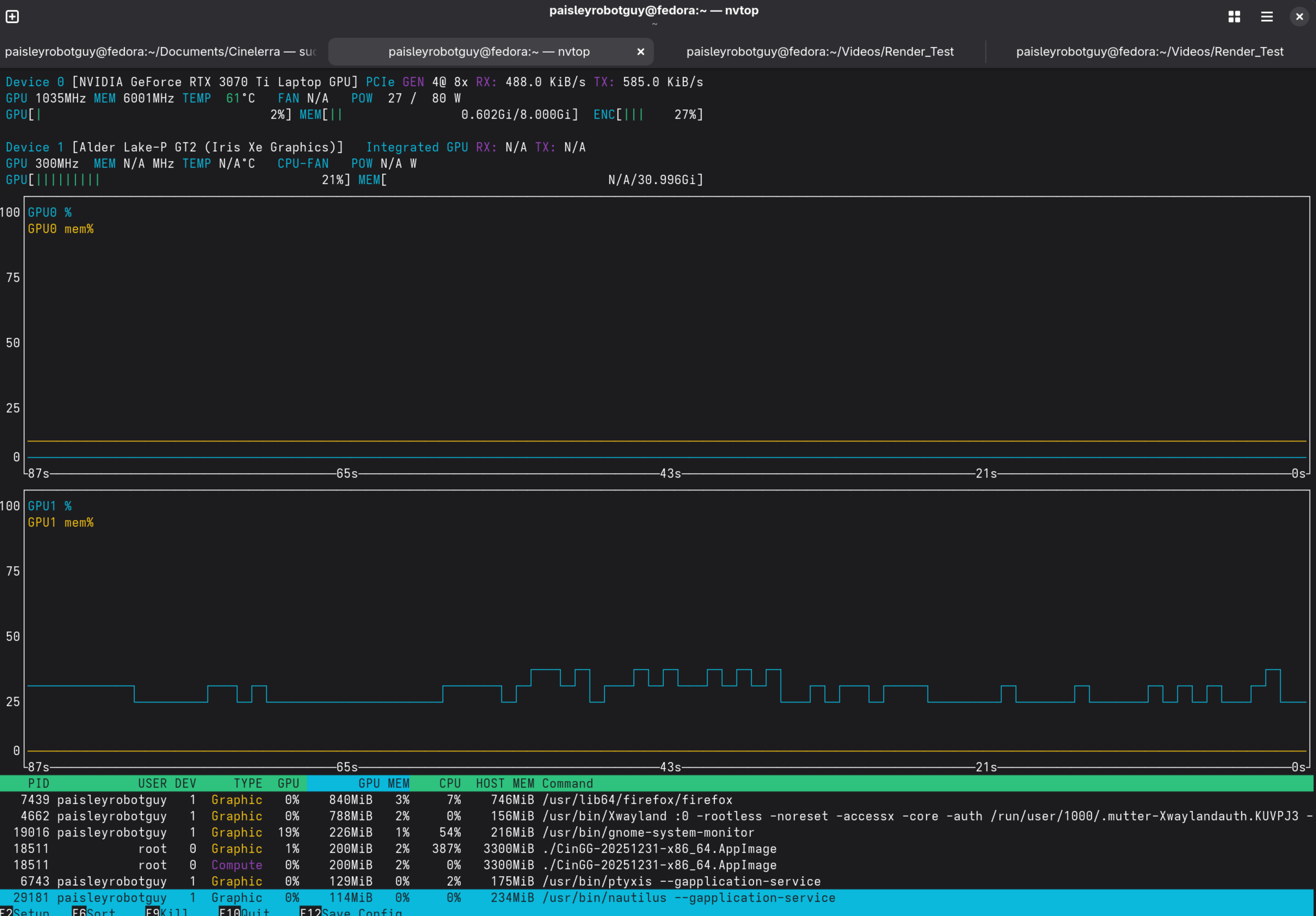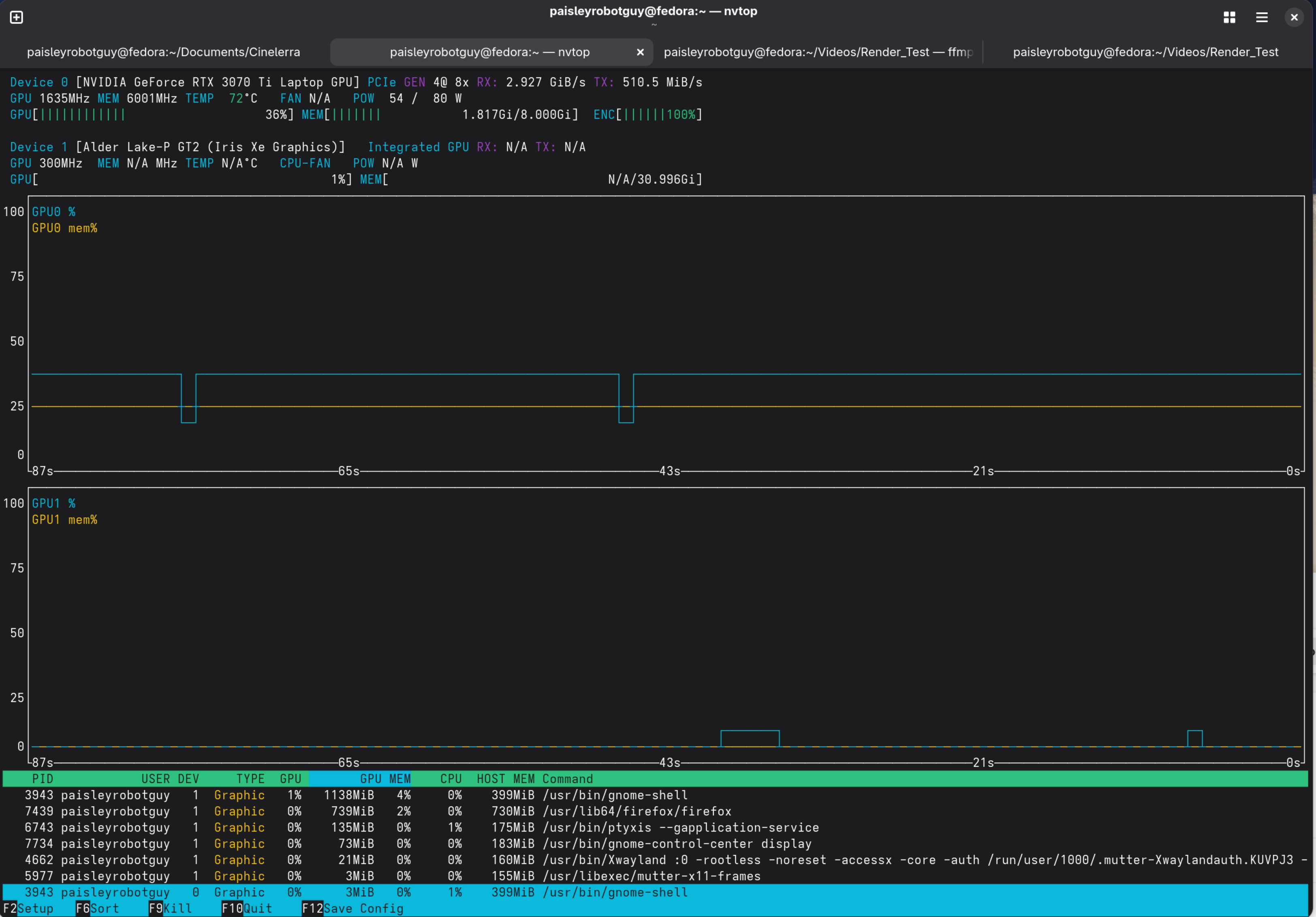 Here is an update. I'm running Fedora 43 natively on an NVIDIA RTX 3070 TI Laptop GPU. FFMPEG is able to use the GPU to render the video. We see the GPU usage pegs in NVTOP: [image: image.png]