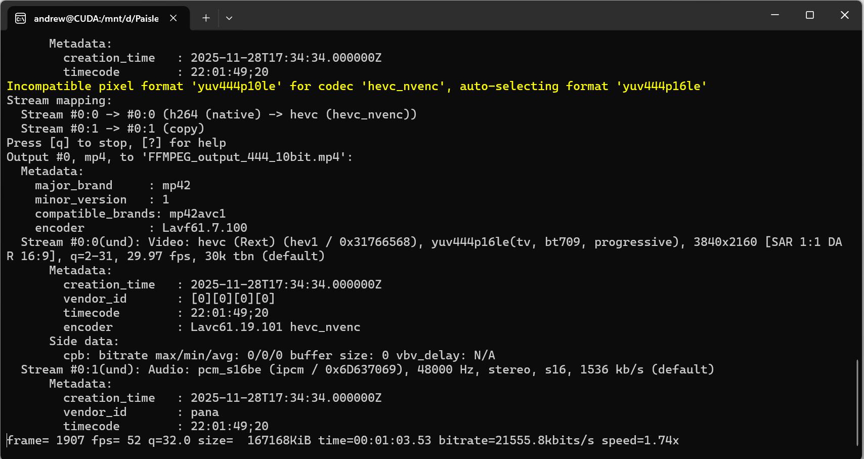 > > > пн, 19 янв. 2026 г., 06:42 Andrew Wesly <[email protected]>: > >> Hello Andrew, >> >> In regards to your question, so I used yuv444p10le on the command >> line, however if you look in the screenshot, FFMPEG autocorrected it to >> yuv444p16le therefore the Cinelerra and FFMPEG formats are equivalent >> (yuv444p16le). My mistake for the typo. My raw video footage is in a >> 10bit-wide colorspace. >> >> Thanks very much for your response, Andrew. Based on your >> explanation, it looks like Cinelerra is working as expected, it's just that >> FFMPEG and Cinelerra use a different rendering algorithm if I understand >> correctly. Quick follow-up question for you - I'm currently using an NVIDIA >> RTX3070 Laptop GPU for my rendering. How likely is it that upgrading to a >> later series GPU such as an NVIDIA 5000 series GPU would accelerate the >> rendering speed? >> > > > It really depends on drivers (proprietary in this case), and speed > of bus (pcie?) connecting gpu to rest of the system, and of course how > powerful nvenc block on upgraded GPU ... > > I guess best way to test is to get your software environment as live > image (say Fedora installed on usb flash/external hdd) and try this on > specific computer before upgrading your own .... > > >> Many thanks, >> Andrew Wesly >> >> >> >> On Sun, Jan 18, 2026 at 6:55 PM Andrew Randrianasulu < >> [email protected]> wrote: >> >>> >>> >>> On Mon, Jan 19, 2026 at 1:55 AM Andrew Wesly via Cin < >>> [email protected]> wrote: >>> >>>> Hello everyone, >>>> >>>> I really do appreciate the prompt support especially since it's >>>> over the weekend. So, yes this is part of using CUDA to render video on >>>> Fedora in WSL. I've tried compiling Cinelerra on Fedora within WSL on my >>>> NVIDIA GeForce RTX machine and for some reason the LADSPA dependency will >>>> not install. I'm not sure what the issue was. As part of a workaround I >>>> tried using Fedora natively on my machine in case WSL was the issue. >>>> However, there were issues with me compiling Cinelerra on Fedora due to >>>> issues installing dependencies with the configuration script; it, the >>>> script seemed to not want to work with my version of Fedora due to >>>> downloading dependencies. >>>> >>>> Upon digging further, I can see that FFMPEG on WSL is able to >>>> successfully render video on my machine at a 1.5 to 1.75 speed up. The >>>> input video is 4K YUV4:2:2 video with 10-bit color resolution in MP4 >>>> format. Here is the command run in wsl (Fedora): "ffmpeg -y -i >>>> CINELERRA_FFMPEG_DEBUG_DUMMY_FILE.MP4 -c:v hevc_nvenc -pix_fmt yuv444p10le >>>> -profile:v main10 -cq 20 -preset p5 -c:a copy FFMPEG_output_444_10bit.mp4" >>>> [image: image.png] >>>> As we can see the speed up is 1.74x and in Windows Task manager >>>> we see the GPU gets pegged as expected: >>>> [image: image.png] >>>> >>>> However in Cinelerra i select the h265_nvenc mp4 codec in the >>>> render profile: >>>> [image: image.png] >>>> The render rate seems to be <.5 the framerate and the GPU usage >>>> does not look right, it looks choppy: >>>> [image: image.png] >>>> >>>> So here, it seems that Cinelerra may be using the GPU, but not >>>> optimally. >>>> >>> >>> >>> Yeah, we transfer frames into CPU memory (even if they decoded on >>> GPU), then push them back to GPU via PCIe ... >>> >>> ffmpeg probably can do its transcoding without moving frames in >>> and out. >>> >>> Also, why 444p16 in cinelerra case, when ffmpeg does >>> just yuv444p10le ? I think it expanded to 16bit per channel inside >>> cinelerra anyway, but not sure if picking this pixel format will make no >>> difference, or trigger some additional conversion ? >>> >>> >>>> For these reasons, I am under the assumption that: >>>> >>>> - The issue is with the FFMPEG version that Cinelerra 5.1 uses >>>> - WSL is NOT the issue because a version of FFMPEG on the WSL >>>> environment optimally uses the GPU with the same nvenc codec. >>>> >>>> >>>> Thoughts? Comments? >>>> >>>> Many thanks, >>>> Andrew Wesly >>>> >>>> On Sun, Jan 18, 2026 at 11:24 AM Terje J. Hanssen < >>>> [email protected]> wrote: >>>> >>>>> This earlier thread may be of some background interest, where >>>>> Andrew Randrianasulu guided me to build Cingg from git using the system >>>>> FFmpeg and libs on openSUSE Tumbleweed-Slowroll. >>>>> >>>>> https://www.mail-archive.com/[email protected]/msg07928.html >>>>> >>>>> >>>>> On 1/18/26 7:04 PM, Phyllis Smith via Cin wrote: >>>>> >>>>> Forwarding to the mailing list instead of just me. >>>>> >>>>> ---------- Forwarded message --------- >>>>> From: Phyllis Smith <[email protected]> >>>>> Date: Sat, Jan 17, 2026 at 7:47 PM >>>>> Subject: Re: Cinelerra FFMPEG Questions >>>>> To: Andrew Wesly <[email protected]> >>>>> >>>>> >>>>> 1. It is a little hard to say for sure depending on how the >>>>> package you installed did the build. But most likely the ffnpeg routines >>>>> will be in a subdirectory of something like >>>>> cinelerra-5.1/thirdparty/ffmpeg-8.0 >>>>> (edited - if I remember correctly, you used Andrey's Fedora >>>>> build which is the best option for you) >>>>> >>>>> 2. Again most likely the fedora package you are using was built >>>>> using its own ffnpeg routines and not your systems version. >>>>> (edited - 3. You can not point to a different ffmpeg version >>>>> unless you do you own build.) >>>>> >>>>> For what purpose are you looking for the ffnpeg routines? >>>>> >>>>> >>>>> On Sat, Jan 17, 2026, 13:38 Andrew Wesly <[email protected]> >>>>> wrote: >>>>> >>>>>> Hello Phyllis and Cinelerra Team, >>>>>> >>>>>> I'm looking through the CinelerraGG_Manual.pdf document for >>>>>> information about configuring FFMPEG and I have a few basic questions for >>>>>> you. >>>>>> >>>>>> 1) The manual states that Cinelerra has an FFMPEG configuration >>>>>> directory. However, where si that directory located on default Linux >>>>>> installs, Fedora specifically? >>>>>> >>>>>> 2) I installed Cinelerra pre-built from a repository. What 