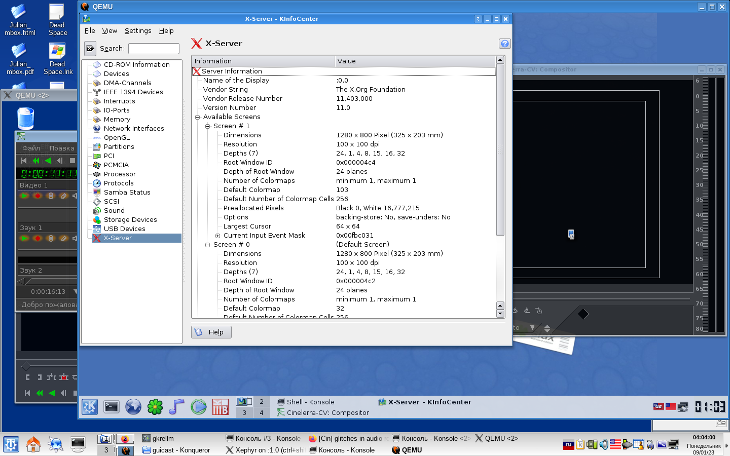 Managed to get qemu (v7.2.0-334-g959b27f577-dirty) running with two virtual displays qemu-system-x86_64 -enable-kvm -m 2000 -cpu qemu64 -device virtio-vga,max_outputs=2 -device virtio-vga -cdrom /home/admin/CDROM-4.14.246-big-7.iso -smp 2 -device usb-mouse -M q35 -usb then in running system I run xconf (script configuring X from old Slax 6) and then startx bring me two displays. first i send xterm to second display by using DISPLAY=":0.1" from there I launchd cinelerra I typed :0.0 in CinCV's output config tab, and on next startup Compositor was on original first display..