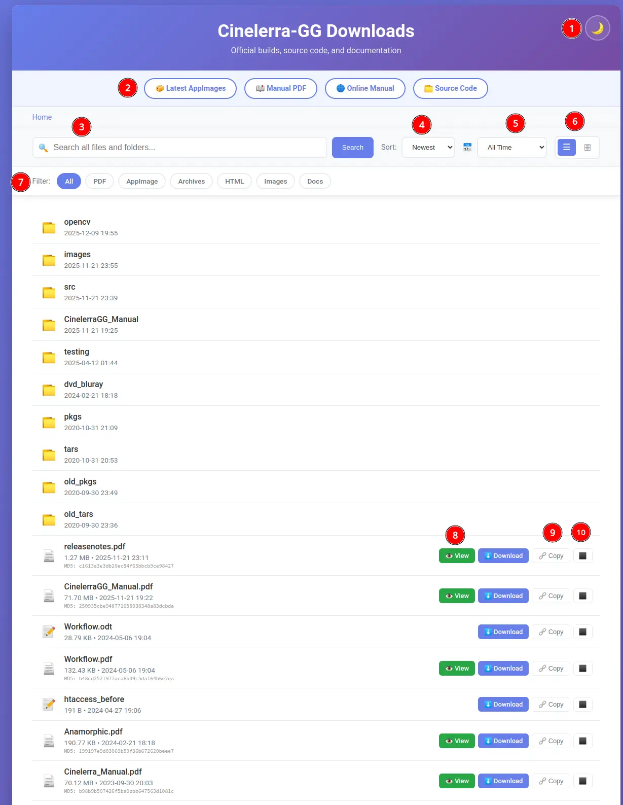 Cinelerra-GG Download Center - Updates Screenshot-Cin-Donwload-Center ------------------------------------------------------------------------ * * *New Features & Improvements * *Search & Navigation* * Global Search – Search across all folders and subfolders * File Type Filters – Quick filter by PDF, AppImage, Archives, HTML, Images, Docs * Date Filter – Filter by Last 7/30/90 days or This Year * Keyboard Navigation – Navigate with arrow keys (↑/↓), open with Enter, download with D, copy link with C, show QR with Q * Sticky Toolbar – Search and filter bar stays visible while scrolling *Display & Views* * Grid/List Toggle – Switch between compact list and visual grid view * Image Thumbnails – Real image previews with lightbox for full-screen viewing * Dark Mode – Toggle between light and dark theme (auto-saves preference) * NEW Badges – Visual indicator for files uploaded in the last 7 days *File Actions* * Copy Link Button – One-click copy of download links to clipboard * QR Code Generator – Generate scannable QR codes for mobile downloads * View in Browser – HTML and PDF files can be viewed directly in browser * MD5 Checksums – Display file checksums where available *Feeds & Extras* * RSS Feed – Subscribe to latest uploads at /feed.php * Quick Links Bar – Direct access to Latest AppImages, Manual, and Source Code * Back to Top – Floating button for easy navigation * Toast Notifications – Visual feedback for actions *Technical* * Smart Sorting – Sort by date, name, or size (newest first by default) * Responsive Design – Optimized for mobile, tablet, and desktop * Security Hardened – Protected against XSS, path traversal, and header injection * Fast Loading – Lazy-loading images and optimized performance ------------------------------------------------------------------------ *Visit:* https://download.cinelerra-gg.org
