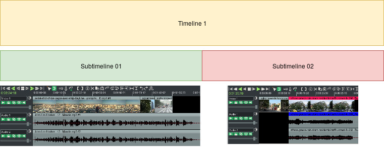 "Multiple timelines" not OpenTimelineIO: https://www.youtube.com/watch?v=YOw6f8IBIho https://www.youtube.com/watch?v=-j0al5nO83M [In my opinion:] OpenTimelineIO I think it's better to postpone it because it's a project still in beta, written in Python and based on QT. Maybe it's better not to waste time on it now: https://github.com/PixarAnimationStudios/OpenTimelineIO However, the idea of a standard EDL that allows you to convert and use the EDLs of various programs is extraordinary and I hope it will be adopted in the future.
